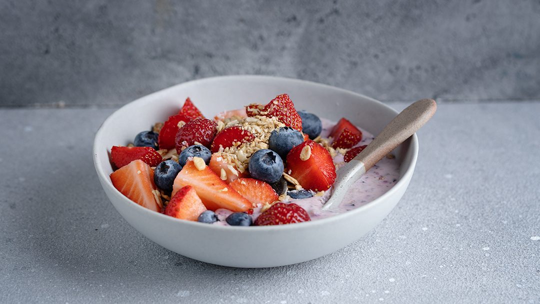 • Iogurte grego natural com frutas vermelhas e granola sem açúcar: O iogurte grego é rico em proteína. As frutas vermelhas adicionam carboidratos e antioxidantes, e a granola contribui com fibras e uma textura crocante.
